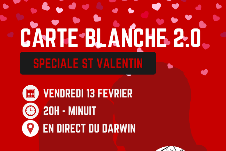 Retrouvez toute la folle équipe de Carte Blanche, ce vendredi 13 février de 20h à minuit en direct du Pub le Darwin à Châtenois ! Réservez votre place au bar pour assister à l'émission sur : le-darwin.fr