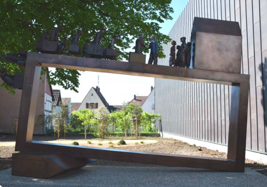 L'imposante sculpture en bronze noir, qui sera installée près de l'arbre de la Liberté dans le square de la rue Kolb, mesure 5,60 mètres de haut pour 3,20 mètres de large. Elle représente un cadre rectangulaire écrasant une maison, symbolisant les foyers détruits par la guerre. Des personnages voûtés sous le poids de leurs bagages illustrent l'exode forcé des Marckolsheimois.