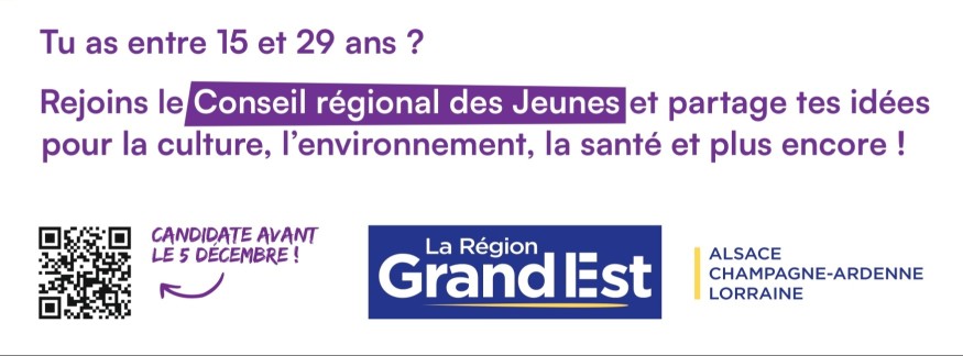 Si toi aussi tu veux t’engager, partager tes idées et devenir acteur du territoire du Grand Est, candidate avant le 5 décembre 2025, sur le site grandest.fr