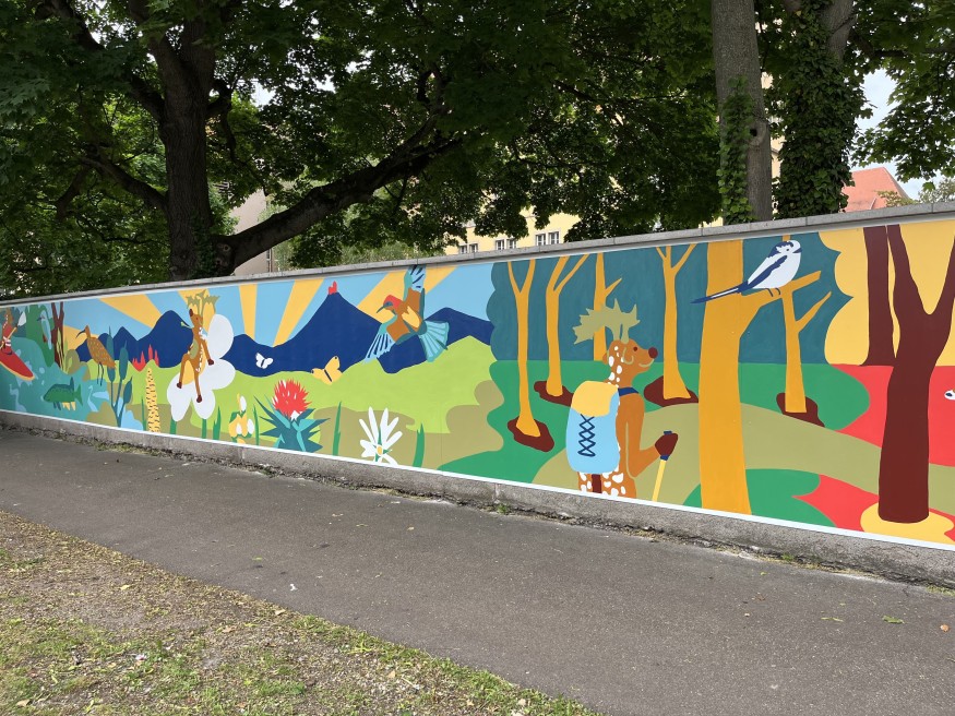 Parmi les éléments phares de la fresque, un daim apparaît à plusieurs reprises. « Deux élèves ont souhaité personnifier et créer une mascotte qui représenterait le parc de l’Ill Wald », précise l’artiste. L’animal emblématique de la réserve y fait du kayak, de la randonnée, ou encore bronze au soleil.