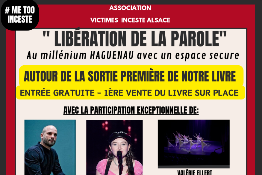 Libération de la parole au Millénium Haguenau. C’est ce vendredi 17 mai à 20H. L’objectif de cette soirée est simple : promouvoir la sortie d’un livre sur l’inceste en Alsace autour d’un programme riche. Conférences, théâtre, danses et chants. L’événement est organisé par l’association Victimes Inceste Alsace. Sa créatrice Davina Deseigne nous en dit un peu plus.