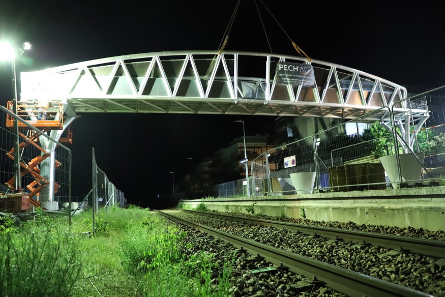 Dans la nuit de mercredi à jeudi, une passerelle piétonne de 27 mètres de long et de 7 tonnes a été érigée au-dessus des voies ferroviaires, à la gare de Bischwiller, en attendant que les travaux des nouveaux aménagements commencent.